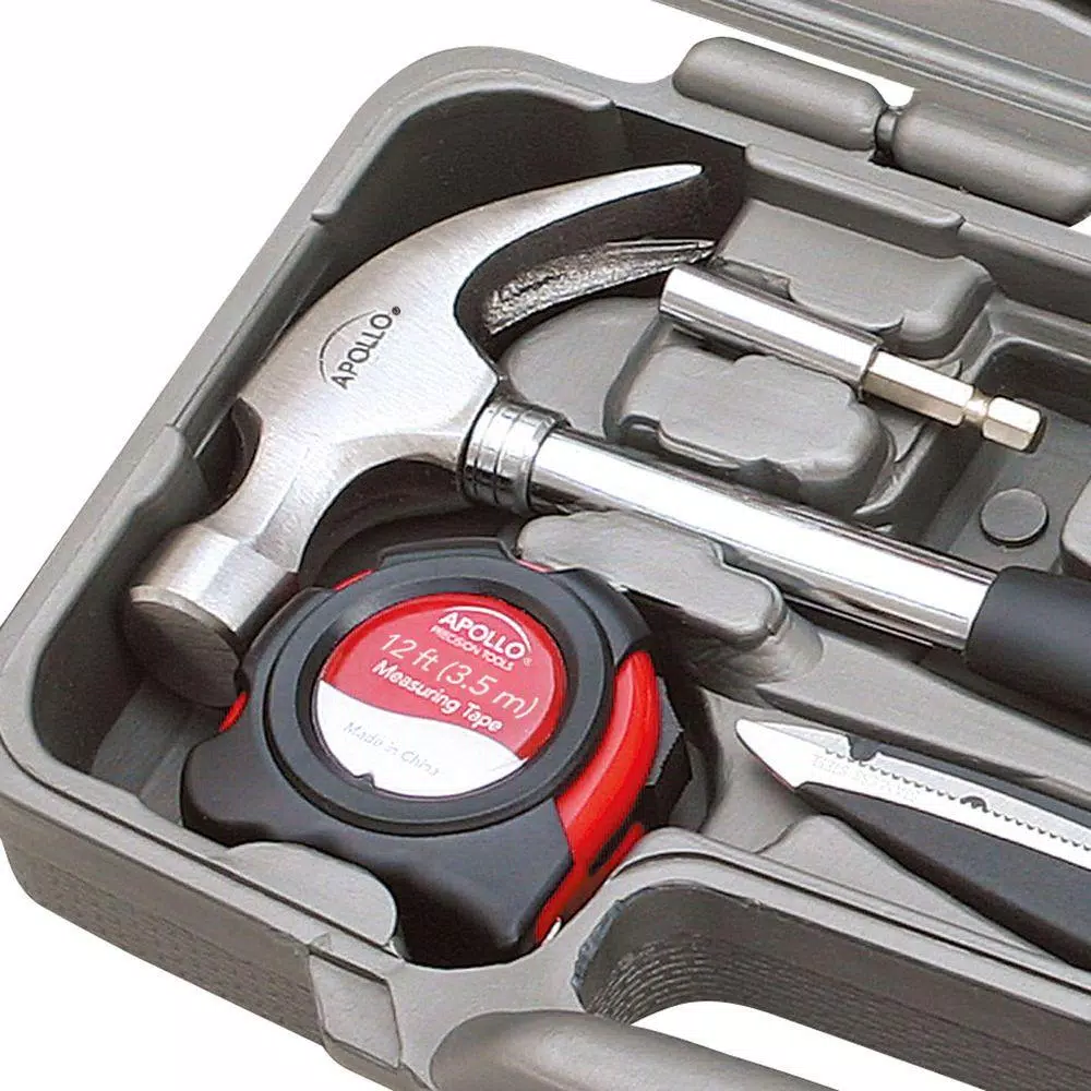 This 39-Piece general tool set contains tools needed for most household repairs. The tools are heat treated and chrome plated to resist corrosion. Contains: 12 ft. Tape measure, Steel claw Hammer with hard rubber grip handle, 6 in. Slip joint pliers, 8 SAE hex keys: 1/16 in., 5/64 in., 3/32 in., 1/8 in., 5/32 in., 3/16 in., 7/32 in., and 1/4 in., Bit driver, 8 in. Scissors, Ten 1 in. bits 1/8 in., 5/32 in., 3/16 in., 1/4 in., PH1, PH2, PH3, PZ1, PZ2, PZ3, Ten 1 in. bits: T10, T15, T20, T25, T27, T30, 1/8 in., 5/32 in., 3/16 in., 1/4 in., 18 mm Plastic knife, 4 Precision screwdrivers: Phillips #1 and #0; slotted 2.4 mm and 3 mm.