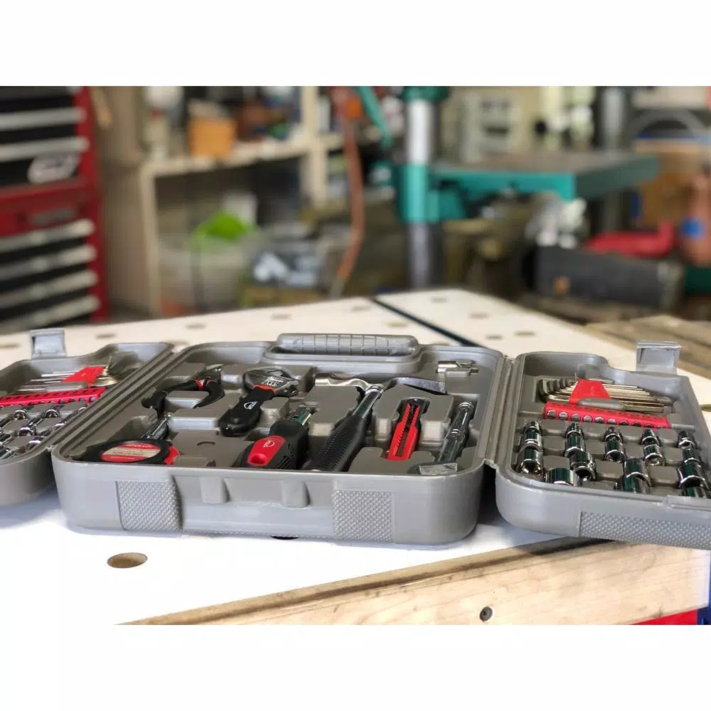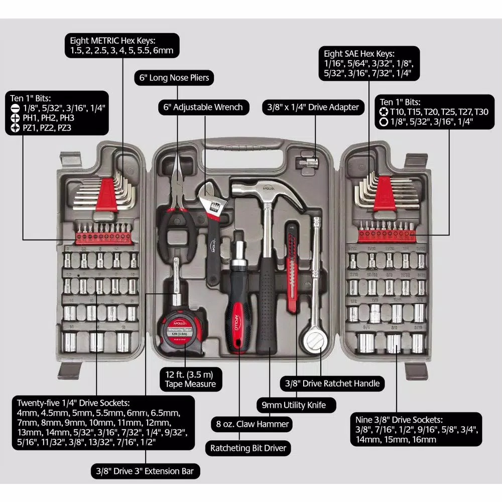 This 79-Piece multi-purpose tool kit contains all the tools necessary for mechanical and household projects. Tools are heat treated and chrome plated to resist corrosion. Contains: Ten 1 in. Bits: 1/8 in., 5/32 in., 3/16 in., 1/4 in., PH1, PH2, PH3, PZ1, PZ2, PZ3, Ten 1 in. Bits: T10, T15, T20, T25, T27, T30, 1/8 in., 5/32 in., 3/16 in., 1/4 in., Eight SAE Hex Keys: 1/16 in., 5/64 in., 3/32 in., 1/8 in., 5/32 in., 3/16 in., 7/32 in., 1/4 in., Eight Metric Hex Keys: 1.5 mm, 2 mm, 2.5 mm, 3 mm, 4 mm, 5 mm, 5.5 mm, 6 mm, 6 in. Long Nose Pliers, 6 in. Adjustable Wrench, 8 oz. Claw Hammer, 9 mm Utility Knife, 12 ft. (3.5 m) Tape Measure, Ratcheting Bit Driver, 3/8 in. Drive Ratchet Handle, 3/8 in. Drive 3 in. Extension Bar, 3/8 in. x 1/4 in. Drive Adapter, Nine 3/8 in. Drive Sockets: 3/8 in., 7/16 in., 1/2 in., 9/16 in., 5/8 in., 3/4 in., 14 mm, 15 mm, 16 mm, Twenty-five 1/4 in. Drive Sockets: 4 mm, 4.5 mm, 5 mm, 5.5 mm, 6 mm, 6.5 mm, 7 mm, 8 mm, 9 mm, 10 mm, 11 mm, 12 mm, 13 mm, 14 mm, 5/32 in., 3/16 in., 7/32 in., 1/4 in., 9/32 in., 5/16 in., 11/32 in., 3/8 in., 13/32 in., 7/16 in., 1/2 in.