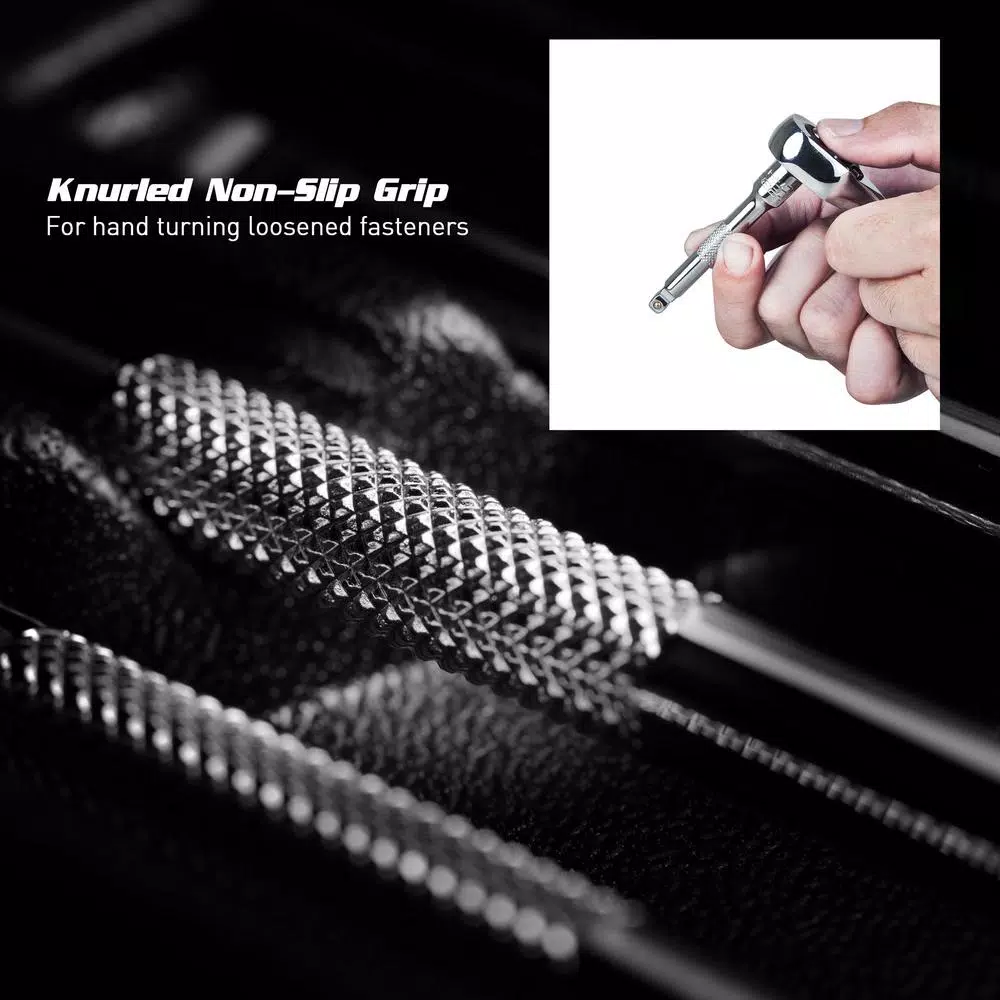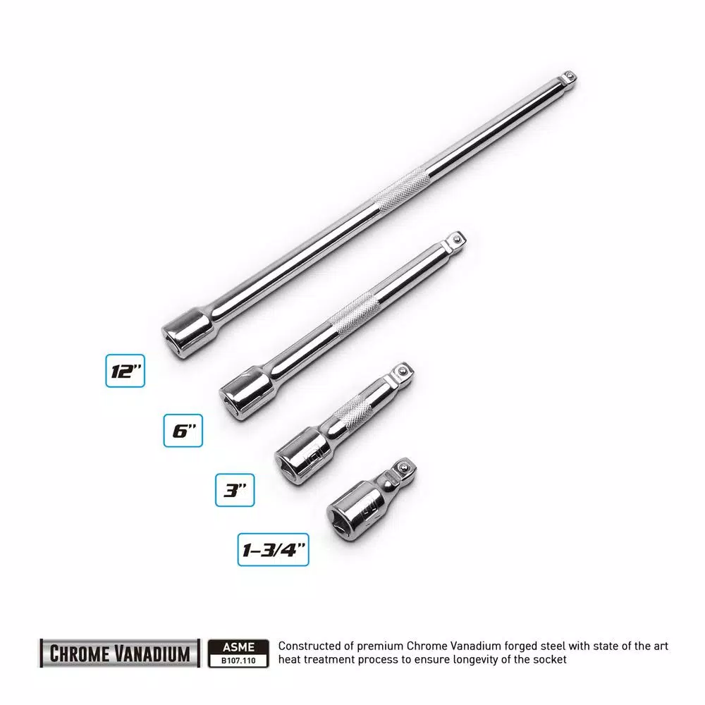 - Four 3/8 in. drive wobble extension bars: 1-3/4, 3, 6 and 12 in. L