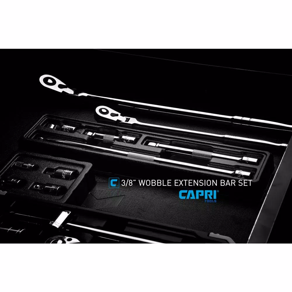 The Capri Tools 3/8 in. Drive Wobble Extension Bar is 2 tools in one. It can be used as a wobble extension bar when an offset clearance is needed or as a regular rigid extension bar. The wobble feature enables you to reach and turn fasteners that are obstructed and can only be reached at an angle. It allows up to 15Β° offset. Spring-loaded ball detent holds sockets securely in place. When fully inserted (not at an angle), the extension bar locks into a regular rigid extension bar. Knurled non-slip grip is designed for hand turning loosened fasteners. These extension bars are constructed of premium Chrome Vanadium steel tempered with our proprietary heat treatment process to withstand more torque. Each item underwent careful polishing and protective plating process to achieve our own chrome finish. Four 3/8 in. drive wobble extension bars are included in the set: 1-3/4, 3, 6 and 12 in. L.
