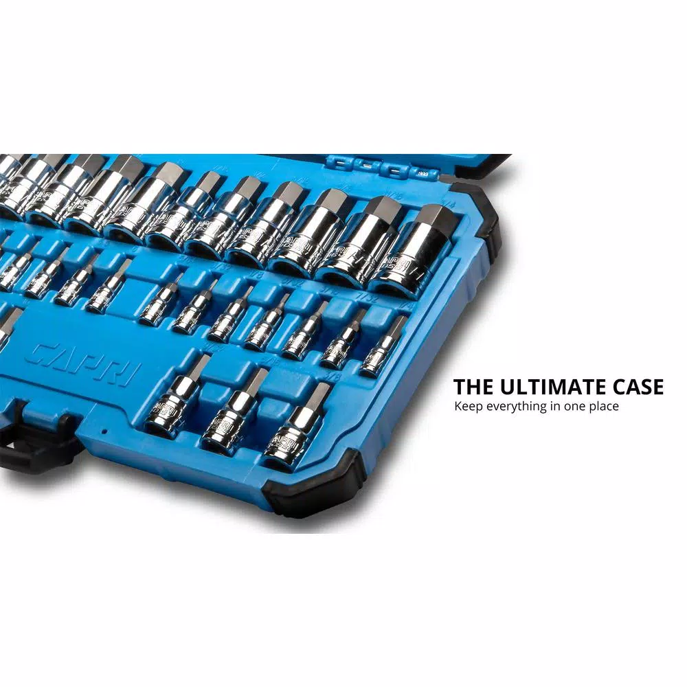 This Capri Tools master hex bit socket set comes complete with 32-pieces of the most popular Hex bits. Each piece is made with tough S2 steel alloy to ensure durability and strength, with a chrome polish to provide maximum oil and corrosion resistance. Both SAE and metric sizes are included. This set comes with a convenient blow-molded storage box for portability and protection. These are perfect for use with breaker bars, torque wrenches and ratchets (not for use with impact tools). This set meets and exceeds ANSI standards and comes with a lifetime replacement guarantee.