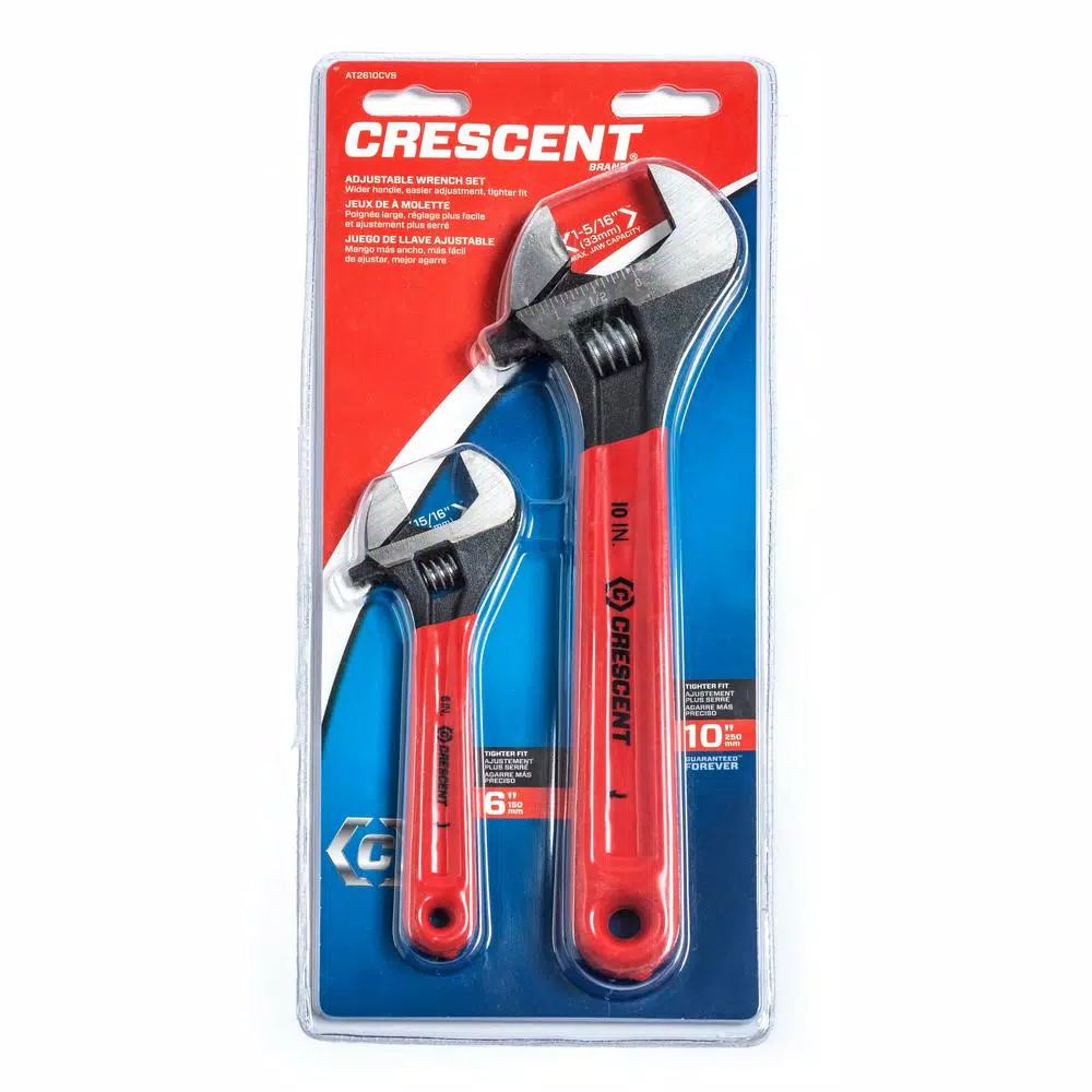 The Crescent 2-Piece Adjustable Wrench Set feature wide-capacity jaws to accommodate a variety of fastener sizes. The set includes a 6 in. wrench and a 10 in. wrench and the wrenches have wide, nonslip cushion. The tension spring stabilizes the jaws and the knurls adjust easily.