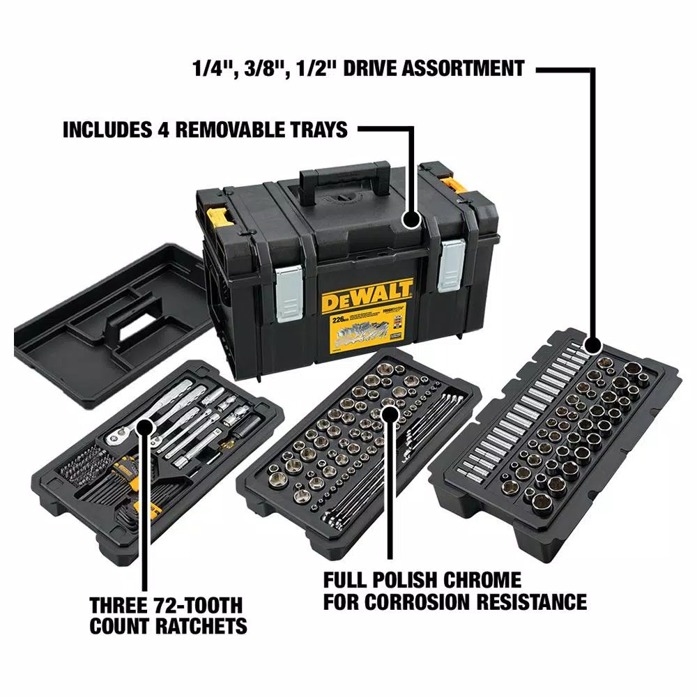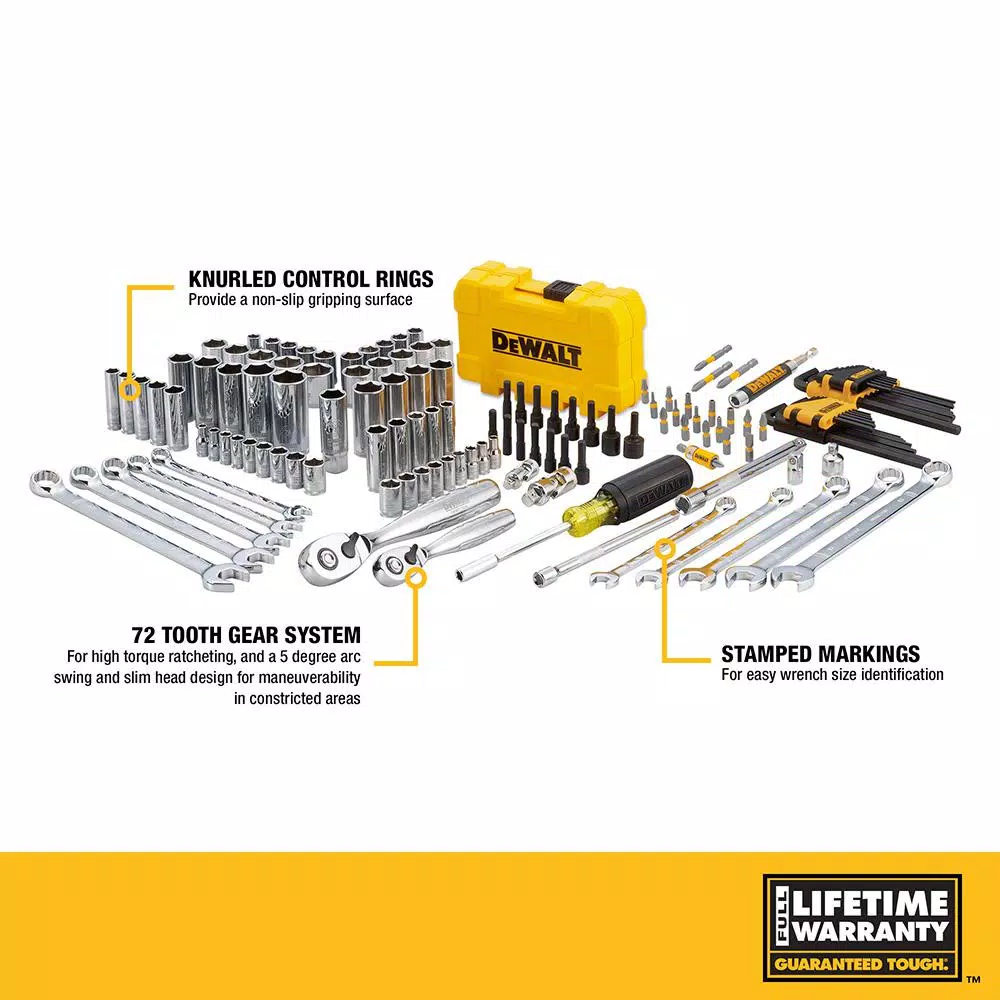 DEWALT has a well-earned reputation for designing and manufacturing many of the worlds most reliable and best-performing professional-grade power tools. Now DEWALT has applied that same no-nonsense, GUARANTEED TOUGH philosophy to its new line of heavy-duty hand tools. The DWMT73802 mechanics tool set is ideal for most fastening applications and includes 3/8 in. and 1/4 in. ratchets and sockets, combination wrenches, hex keys, nut driver, driver bits and more. For a limited time get a bonus TOUGHSYSTEM 22 in. 2-Drawer Tool Box with purchase.