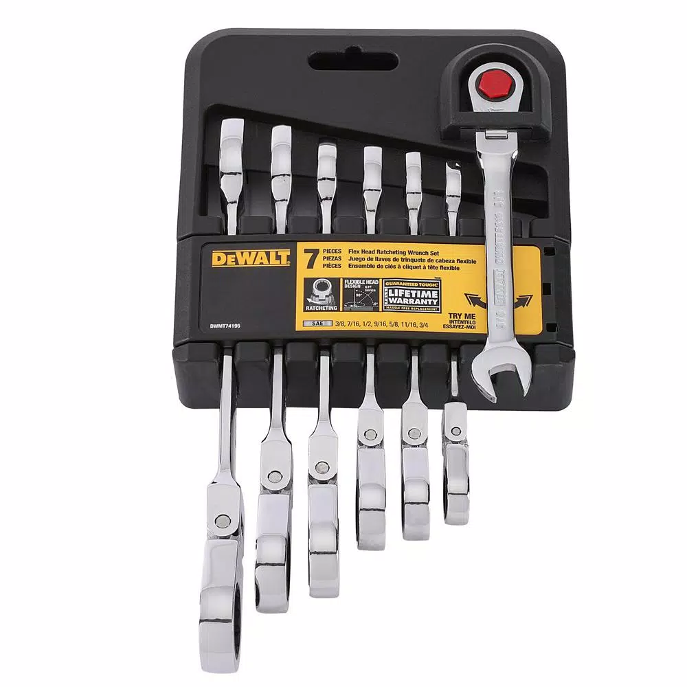 The DWMT74195 ratcheting wrench set is part of the DEWALT guaranteed tough line of Mechanics tools. This 7-Piece Ratcheting Flex Head Combination Wrench Set (SAE) is made with Chrome Vanadium Steel for added strength and durability. The wrenches include stamped markings for easy wrench size identification.