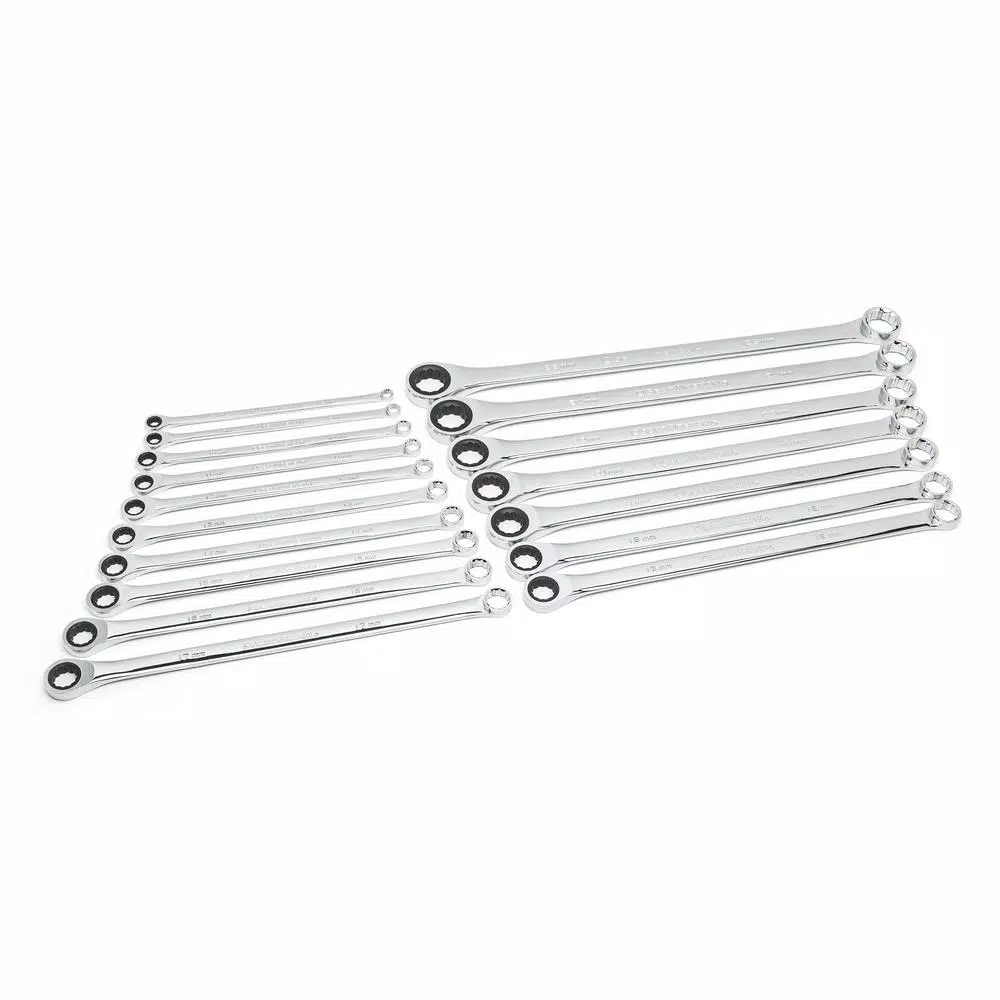 17-Piece GearBox Double Box End metric ratcheting wrench set ratcheting box end needs as little as 5-Degree to move the fastener as opposed to 30-Degree for standard box end wrenches. The standard box end combined with the long pattern length gives this wrench excellent torque capabilities to break a stubborn, rusted fastener. These double box end ratcheting wrenches are made from premium alloy steel for a precision, long lasting tool. The set comes packed in a blow molded tray that fits nicely in your tool box.