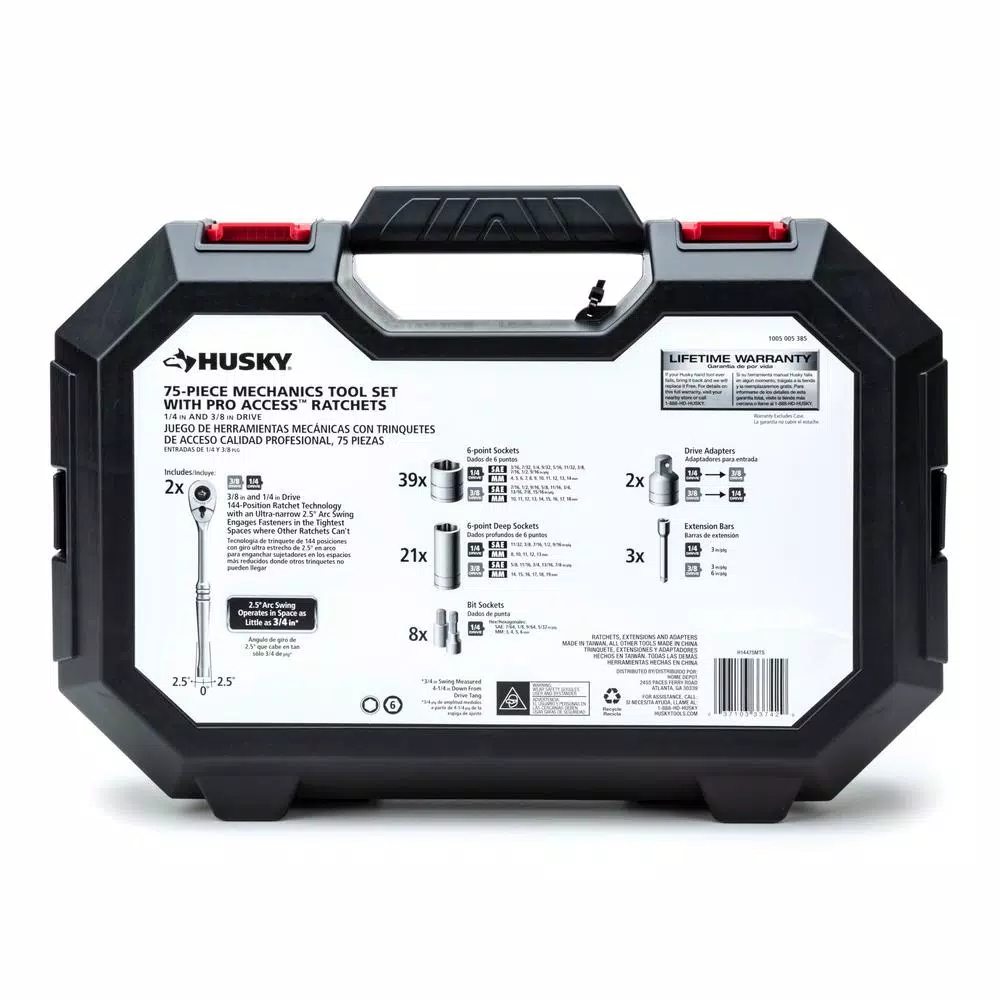 The Dual-pawl technology of the 144-Position ratchet in this Husky 75-piece mechanics tool set provide industry leading access to bolts and fasteners where other ratchets simply canβt. The 68 standard and deep 6-point sockets work to get the job done. The Husky 75-piece 144-position mechanics tools set is perfect for professional mechanics or the DIYer working around the house or in the garage needing access to hard to reach fasteners.