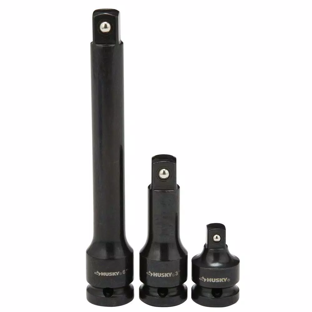 The Husky 3-Piece Impact Accessory Set gives you greater reach and versatility while working with your impact driver . The adapter and extensions are manufactured using Chrome Molybdenum Alloy Steel (Cr-Mo) for added strength and durability. The oil impregnated black oxide finish helps provide corrosion resistance.