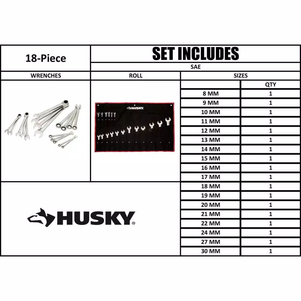 - Master Metric ratcheting wrench set, 18-piece: 8, 9, 10, 11, 12, 13, 14, 15, 16, 17, 18, 19, 20, 21, 22, 24, 27, 30 mm