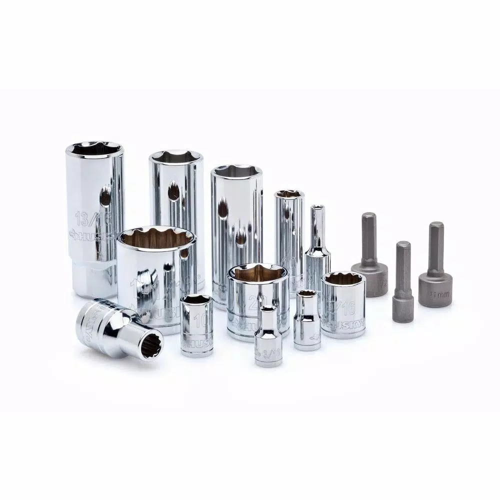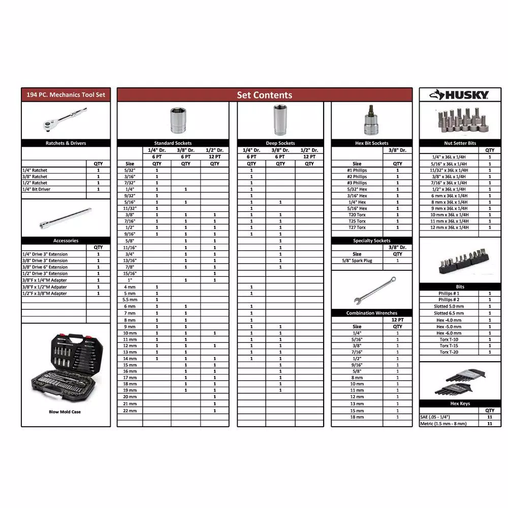 This comprehensive Mechanics Tool Set from Husky includes a generous arsenal of sockets, wrenches and bit sockets to complete nearly any fastening task big or small. Each instruments measured capacity is deeply engraved into its body, providing wear resistance for years of easy readability. A corresponding compartment for each tool is molded into the plastic storage case, making it easy to identify and transport each of the 194-pieces in this set. These durable tools are forged from Chrome Alloy steel designed to stand up to the rigors of frequent use and are coated with a protective finish that wipes clean easily and inhibits corrosion. The 125 different standard and deep sockets along with the 14 combination wrenches allow you to tackle any fastening or repair project. This is the perfect portable set for both professional and DIY mechanics to get the job done.