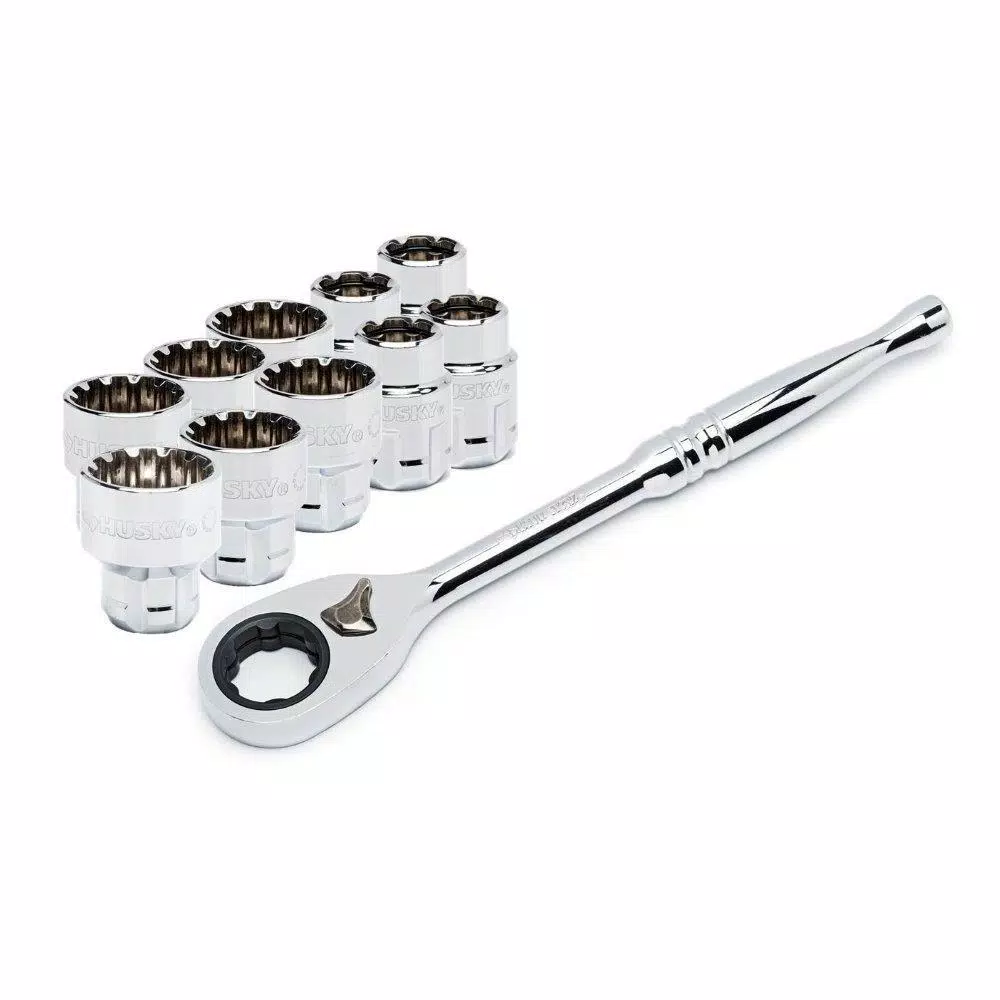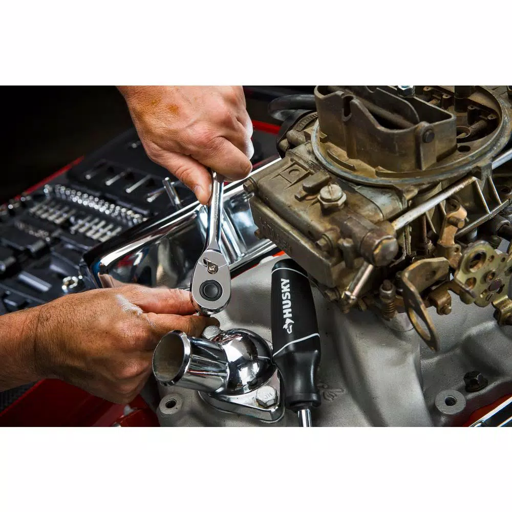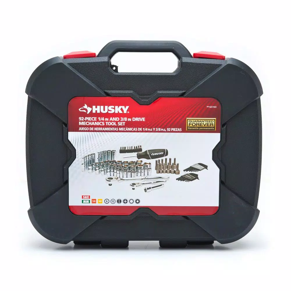 The Husky 92-piece 1/4 in. and 3/8 in. drive mechanics tool set is a great set for the home DIYer or professional mechanic. The 39 different standard and deep sockets allow you to tackle a range of general fastening or repair projects. This set comes with a bonus 11-Piece Husky Pass-Thru Socket set (3/8 in. Drive) that comes with 5 SAE and 5 Metric Sockets and a Pass-Thru Ratchet.