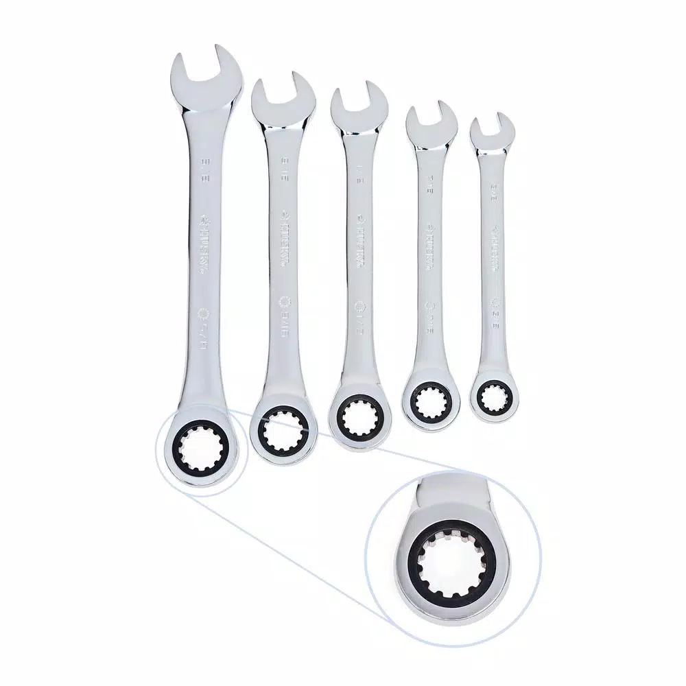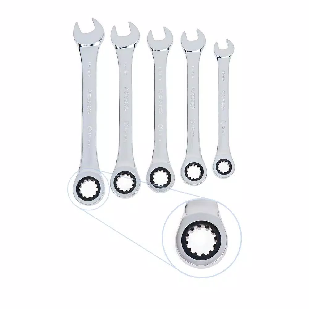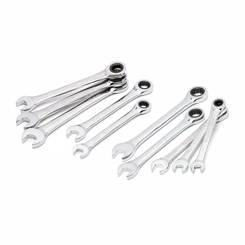- Set includes 10 ratcheting combination wrenches: (5) SAE: 3/8, 7/16, 1/2, 9/16, 5/8 in. and (5) metric: 10, 12, 13, 14, 15 mm