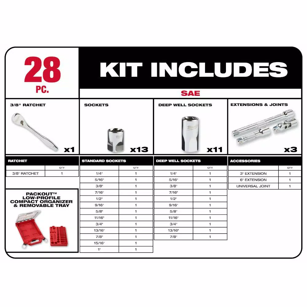 - Includes: standard sockets: 1/4 in., 5/16 in., 3/8 in., 7/16 in., 1/2 in., 9/16 in., 5/8 in., 11/16 in., 3/4 in., 13/16 in., 7/8 in., 15/16 in. and 1 in. D well sockets: 1/4 in., 5/16 in., 3/8 in., 7/16 in., 1/2 in., 9/16 in., 5/8 in., 11/16 in., 3/4 in., 13/16 in. and 7/8 in. accessories: 3 in. extension, 6 in. extension, universal swivel 90-tooth ratchet