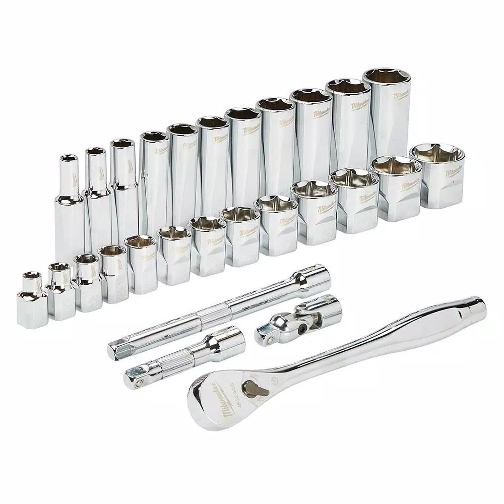 The Milwaukee SAE 28-piece 3/8 in. Drive ratchet and socket set was designed from the ground up to offer better access in tight spaces and maximum tool strength. The 90-tooth ratchet tool offers 4 of arc swing and a slim profile design, allowing work in tighter spaces. Innovative socket design has 4 parallel flats, which deter rolling and are wrench-compatible. Optimized socket geometry helps reduce bolt rounding and stripping. Socket sizes are stamped into the flats for improved easy-to-read visibility. the ratchet and socket kit comes with a removable inner tray, designed to be stored long-term in a steel storage chest. It also comes with a durable carrying case for ultimate portability. The set comes with accessories included so that our users can get every job done, both in the garage and on the jobsite. The ratchet and socket set is backed by a Mechanics Hand Tools Lifetime Guarantee. Milwaukee 8-piece screwdriver set provides professional grade solutions and durability to the user. Bit types are marked on the cap of each tool for quick identification and increased efficiency. The comfortable tri-lobe handle allows users to comfortably apply more leverage.