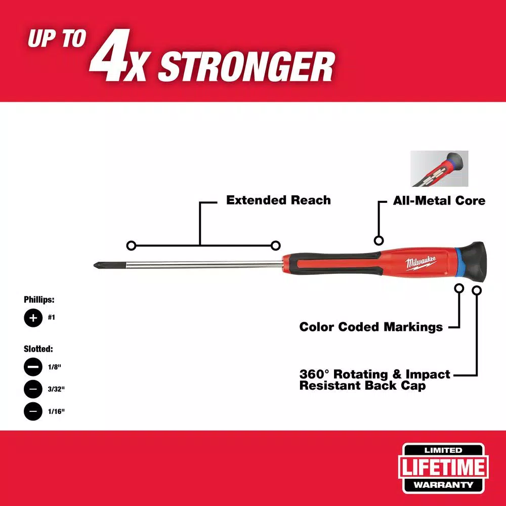 Milwaukee Precision Screwdrivers feature an All-Metal Core for up to 4X strength. Precision machined tips provide secure fitment and long life. The extended reach design and longer shanks deliver improved visibility and reach. 360Β° rotating back caps offer greater control, driving ability and tuning. Additionally, color coded markings allow users to easily ID tool on the jobsite. Chrome plated shanks increase tool life by reducing corrosion and providing superior rust protection.