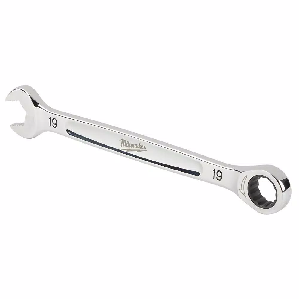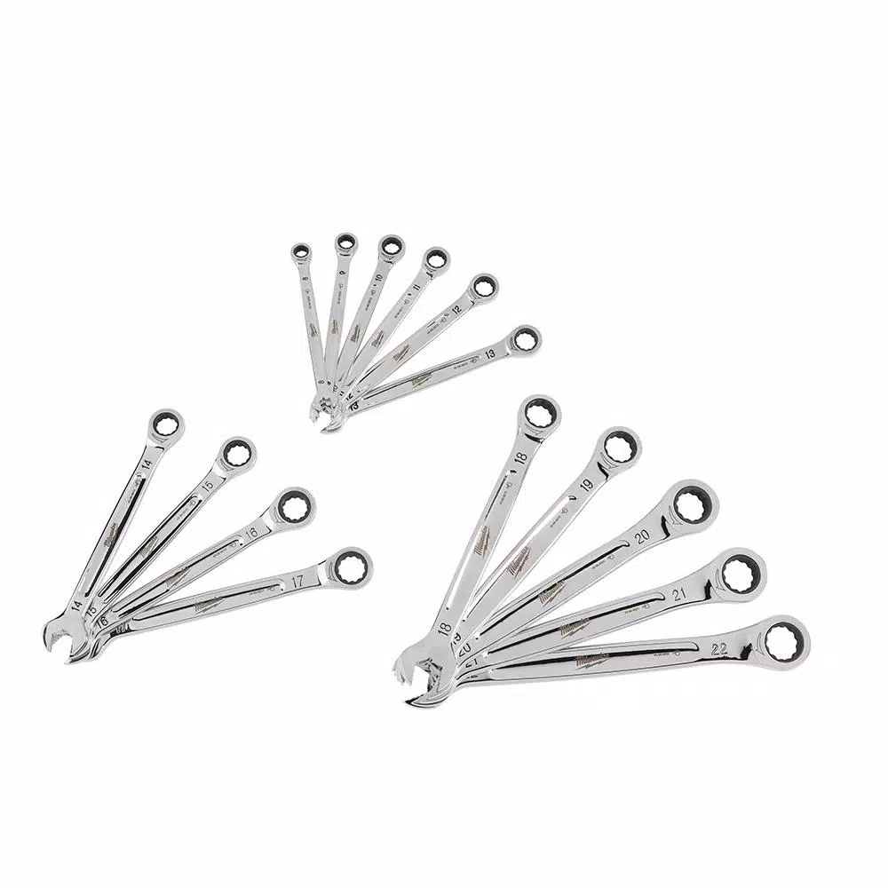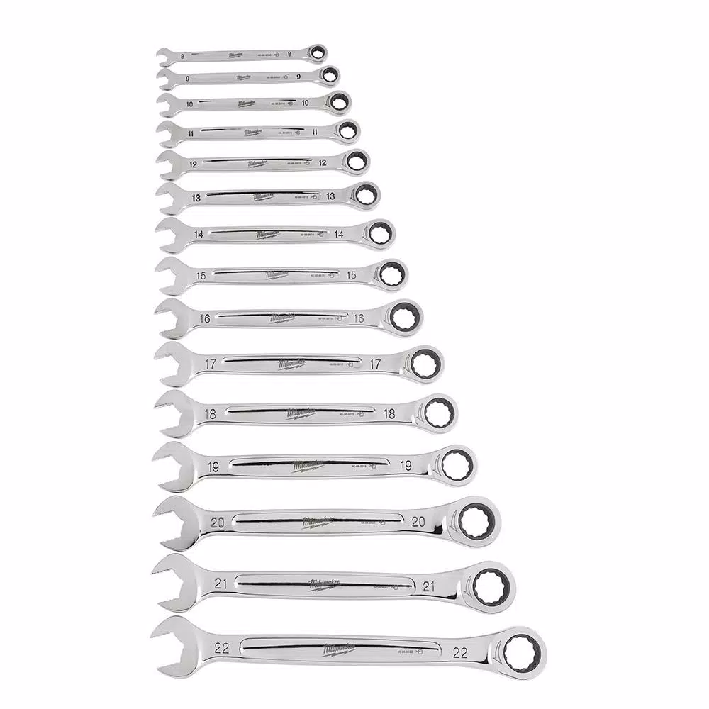 The MILWAUKEE® Metric and SAE Ratcheting Combination Wrench Sets feature 2.5° of arc swing, allowing quick and efficient work in tight spaces. These wrenches feature durable double-stacked pawls in the ratcheting mechanism, offering the longest ratchet life and improved access with 144 ratcheting positions. MAX BITE™ Open-End Grip improves the ratchet wrench’s grip on nuts and bolts, offering 25% more torque than smoth-faced wrenches. Each combination wrench features an ergonomic I-Beam handle design for improved comfort. The ratcheting combination wrench sets features ink-filled size labels for easy size identification, as well as quick distiction between SAE and metric sets. The metric and SAE 15 piece ratcheting combo wrench sets both come in a tray designed for steel storage drawers, allowing for efficient storage with no wasted space. These Milwaukee combination ratchet wrench sets feature a Lifetime Guarantee.