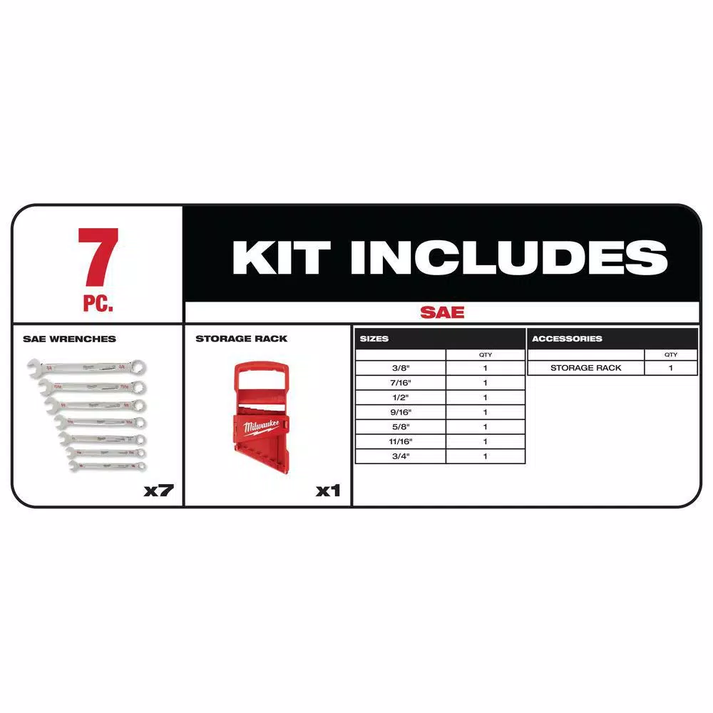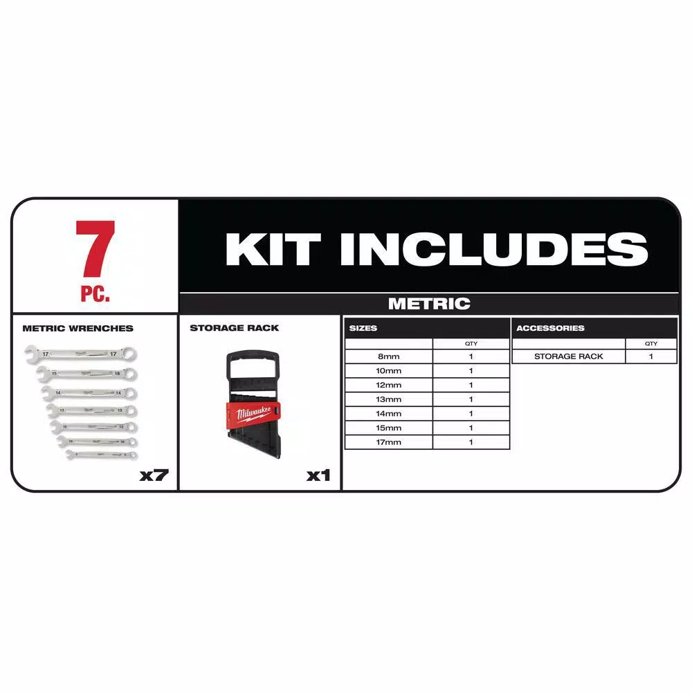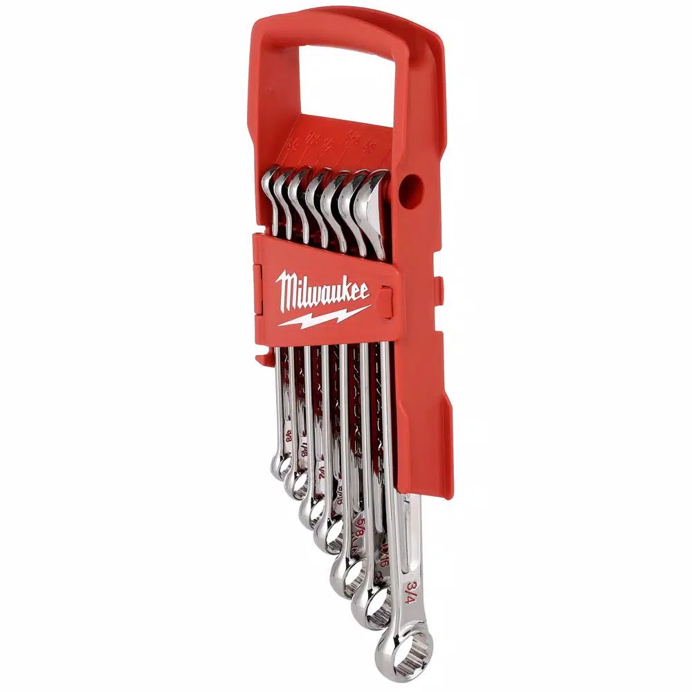 The MILWAUKEE® SAE & Metric 7 piece Combination Wrench Sets are designed from the ground up for mechanical and automotive tradespeople to deliver maximum torque and ultimate user comfort. The MAX BITE™ Open-End Grip improves the open end wrench’s grip on nuts and bolts, and the geometry reduces rounding and stripping. MAX BITE™ offers 25% More Torque than competitive combination wrench designs. The Comfortable I-Beam Handle Design allows superior user comfort, even while applying high torque. The mechanic’s combination wrench sets feature Ink-Filled Size Labels for easy size identification and a quick distinction between SAE and metric sets. Both of the 7pc wrench kits come in a portable, locking storage tray, offering organization both on and off the job site. Milwaukee Tool stands behind their products, offering a Lifetime Guarantee on all of their Combination Wrench Sets.