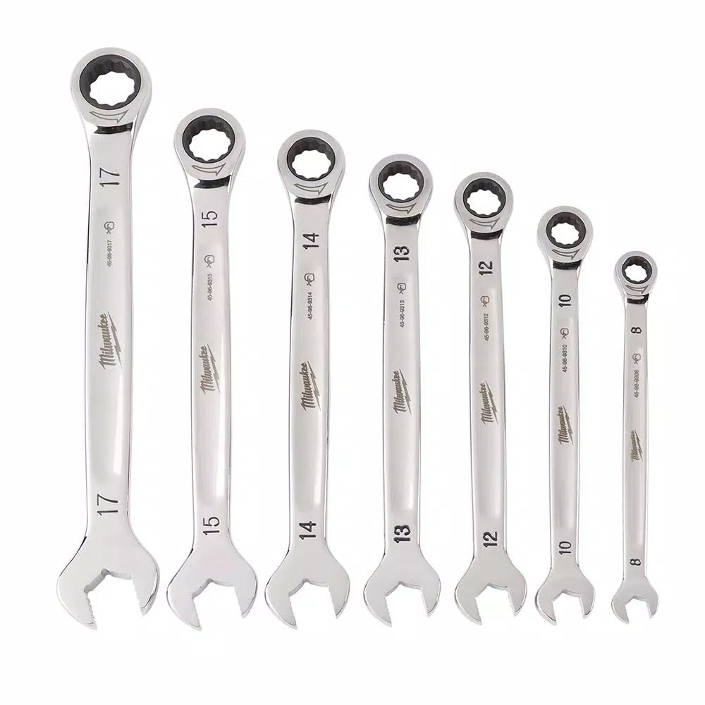 The MILWAUKEE® 7-Piece SAE Ratcheting Combination Wrench Set has a 2.5° of arc swing allowing for quick and efficient work in tight spaces. Milwaukee mechanic wrenches feature durable, double-stacked pawls in the ratcheting mechanism for the longest ratchet life and improved access with 144 ratcheting positions. MAX BITE™ Open-End Grip on these ratchet wrenches improve grip on nuts and bolts, offering 25% more torque than smooth-faced wrenches. The ratcheting combination wrench set is bundled with the Milwaukee 10-Piece TORQUE LOCK™ Pliers set provides more locking force for the professional tradesman. The locking pliers feature a patent pending thumb screw which allows users more clearance to generate more torque with the unique screwdriver through-hole. Milwaukee locking tools and combination wrenches are made for the toughest jobsite applications.