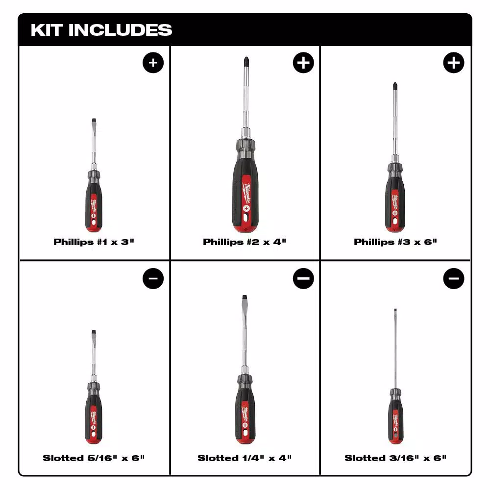 - Includes: (1) Phillips #1 x 3 in., (1) Phillips #2 x 4 in., (1) Phillips #3Γ6 in., (1) slotted 1/4 in. x 4 in., (1) slotted 3/16 in. x 6 in., (1) slotted 5/16 in. x 6 in.