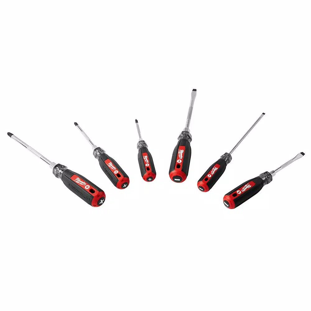 Featuring hardened tips and forged shanks the Milwaukee 6-piece cushion gripe screwdriver set provides professional grade solutions and durability to the user. The wrench-ready bolster and precision knurling offers users the features needed to increase efficiency and effectiveness. The durable handles feature an anti-peel design.