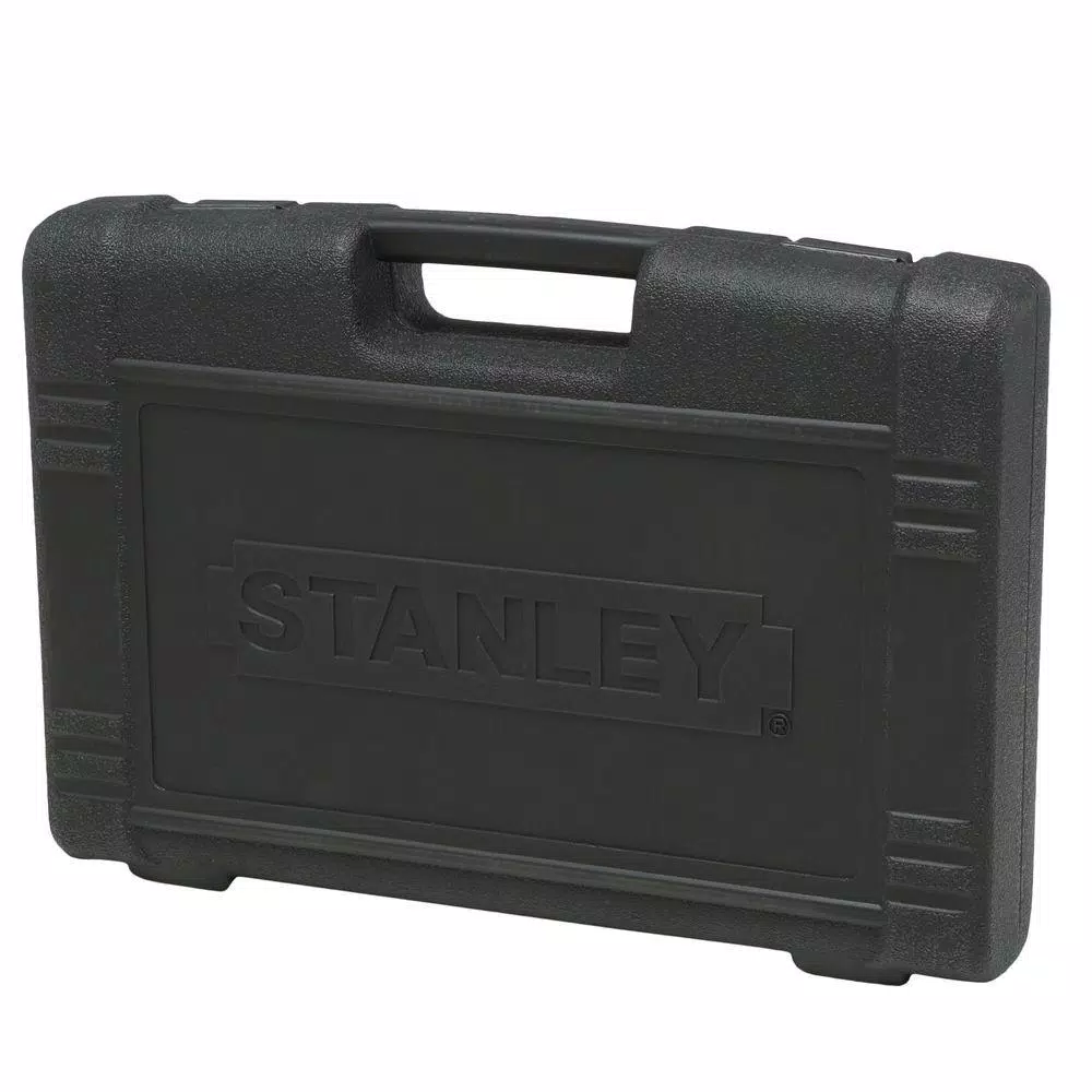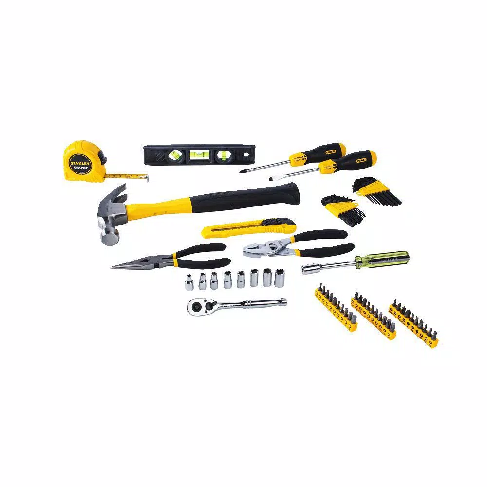 This tool set includes: 30, 1/4 in. dr. specialty bits, 8, 1/4 in. dr. sockets, 1, 16 ft. tape rule, 1, 18mm snap-off knife, 1, 1/4 in. dr. bit holder, 1, 1/4 in. dr. round head ratchet, 1 spinner handle, 1 claw hammer, 1 torpedo level, 1 long nose pliers- 6 in., 1 slip joint pliers-6 in., 1 Phillips screwdriver 2 pt., 1 flat screwdriver 6.5 mm, 8 hex keys-metric, 8 hex keys-SAE, blow molded carry case. Each tool meets or exceeds ANSI specs. All the tools are placed in the blow mold case for secure storage.