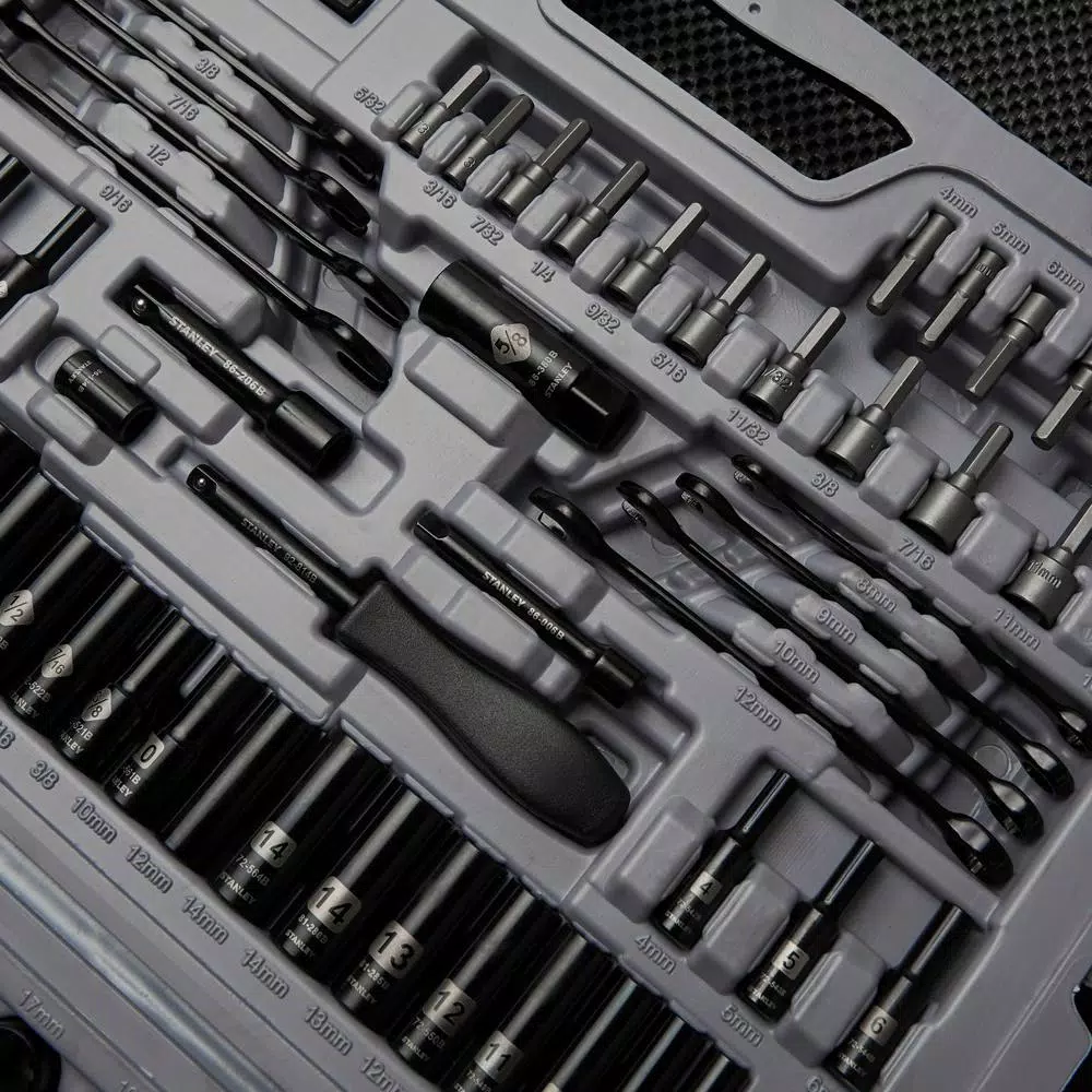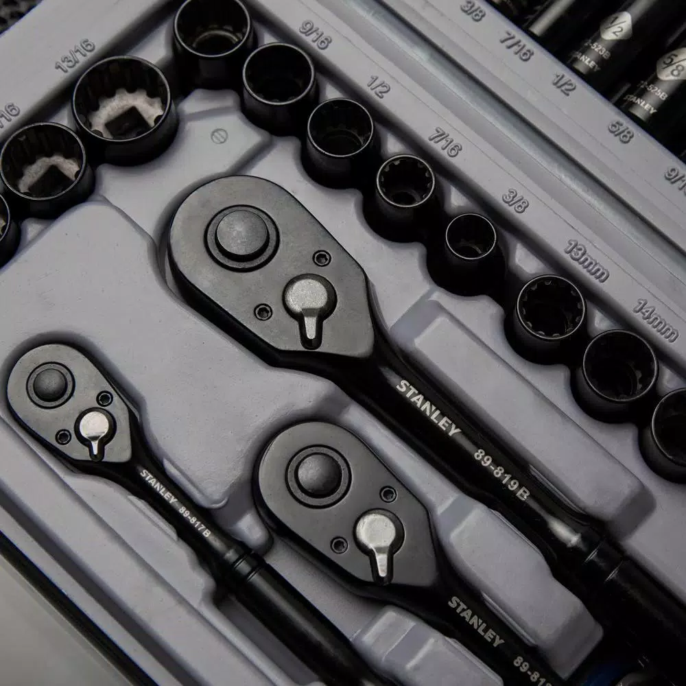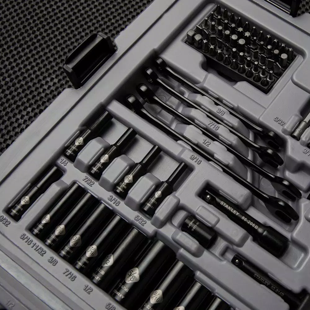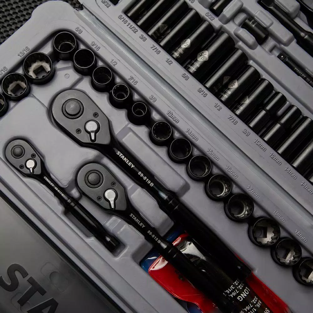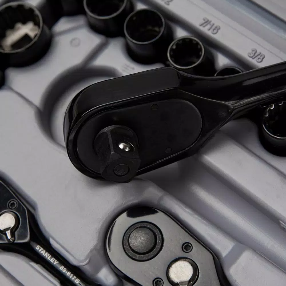 The STANLEY (R) 201 -piece. Mechanics Tool Set is a versatile set with its interior storage compartment for loose parts. The ratchet that is included has a quick release switch and reversible mechanism for easy operation. The included products have a black chrome finish to protect from corrosion.