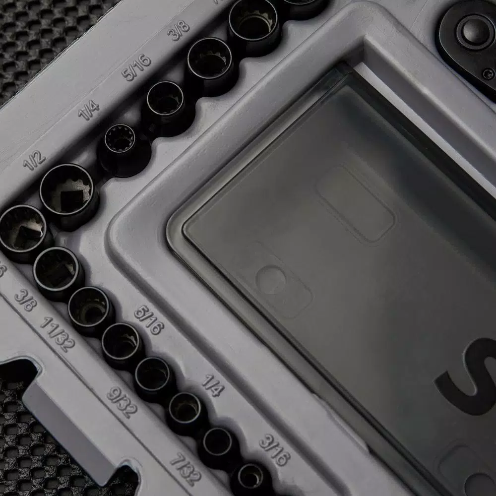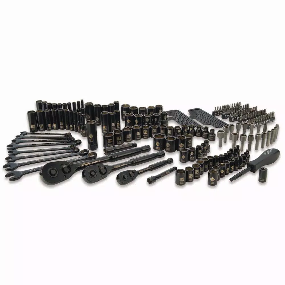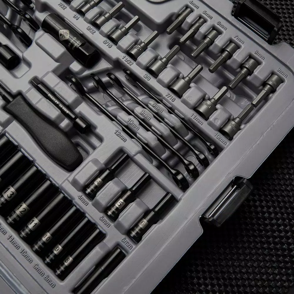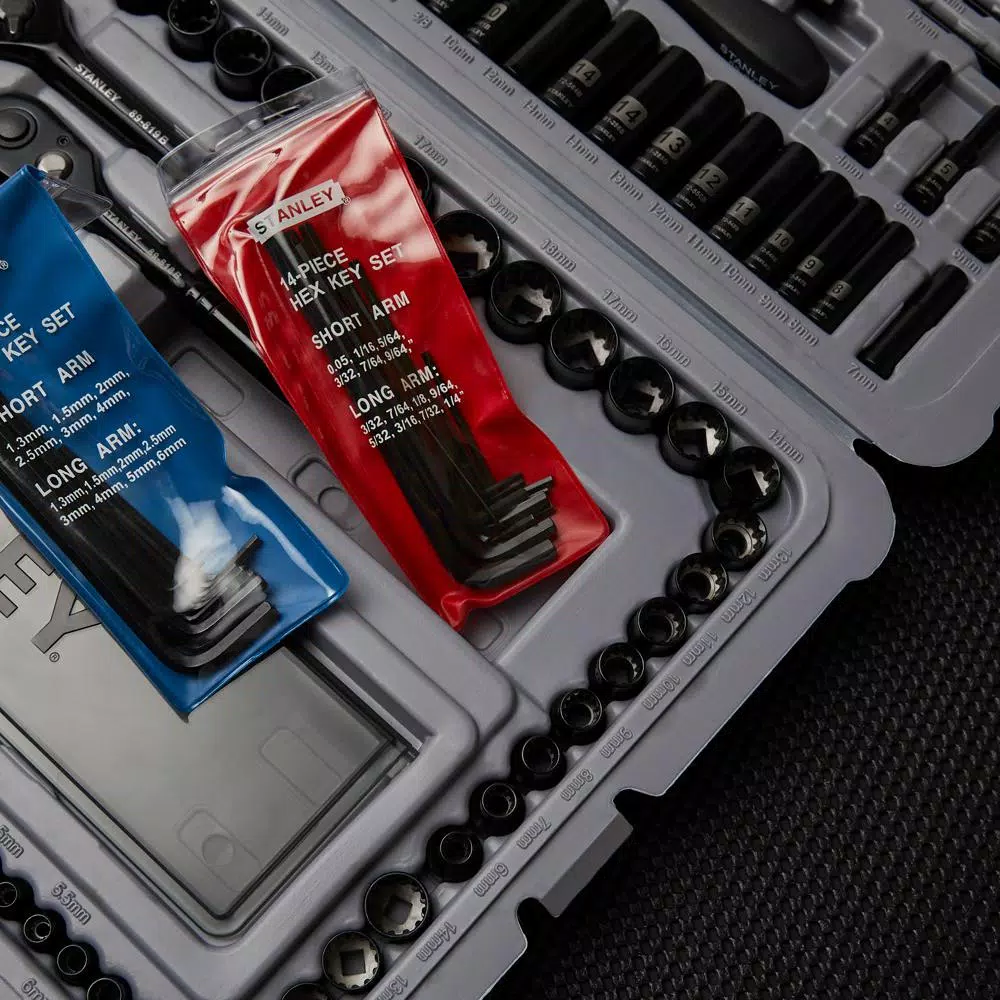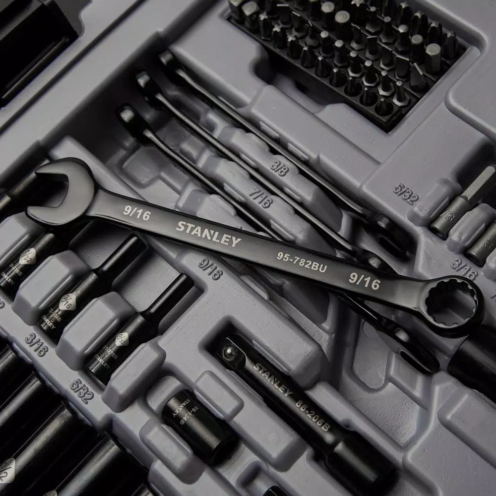 The STANLEY (R) 201 -piece. Mechanics Tool Set is a versatile set with its interior storage compartment for loose parts. The ratchet that is included has a quick release switch and reversible mechanism for easy operation. The included products have a black chrome finish to protect from corrosion.