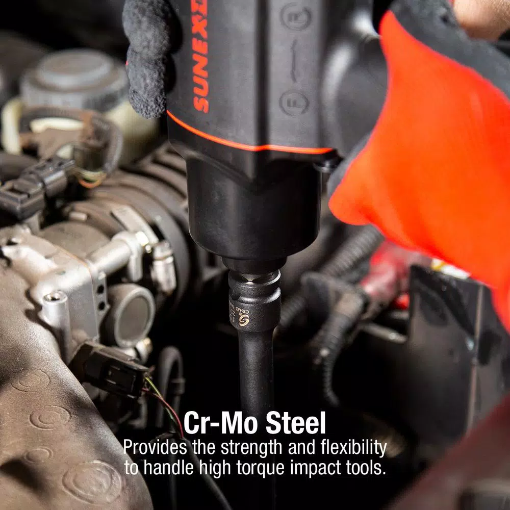 - Cr-Mo steel sockets provide the strength and flexibility to handle high torque impact tools
