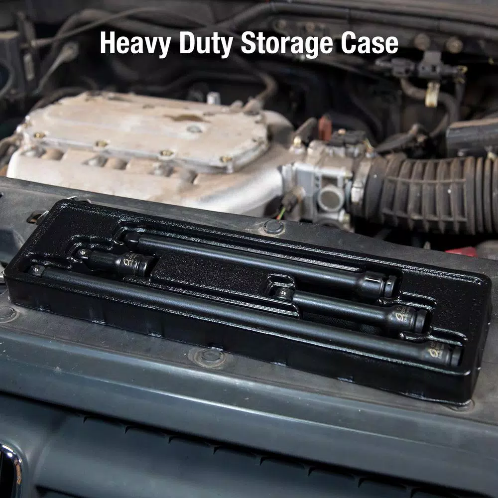 The Sunex 2504 Β½ in. Drive Impact Extension Set comes in SAE sizes 3 in., 5 in., 10 in., and 15 in. Each extension has been forged from high grade Cr-Mo steel, designed with wobble drive, made with a steel ball retainer, and marked by both laser etching and roll stamping to ensure permanent identification. All of this ensures our extensionsβ professional-level performanceβconveniently in a storage tray. Meets ANSI Standards.