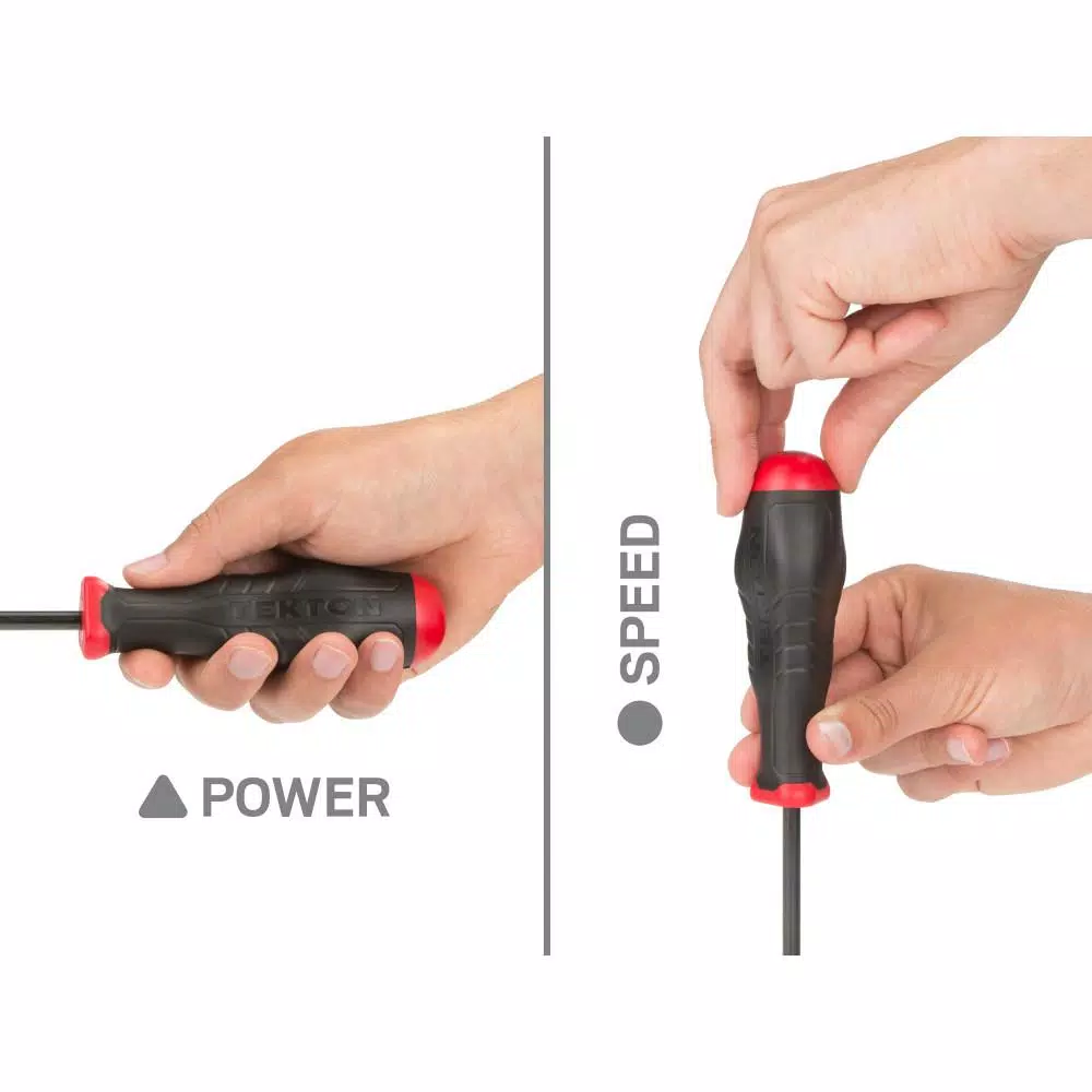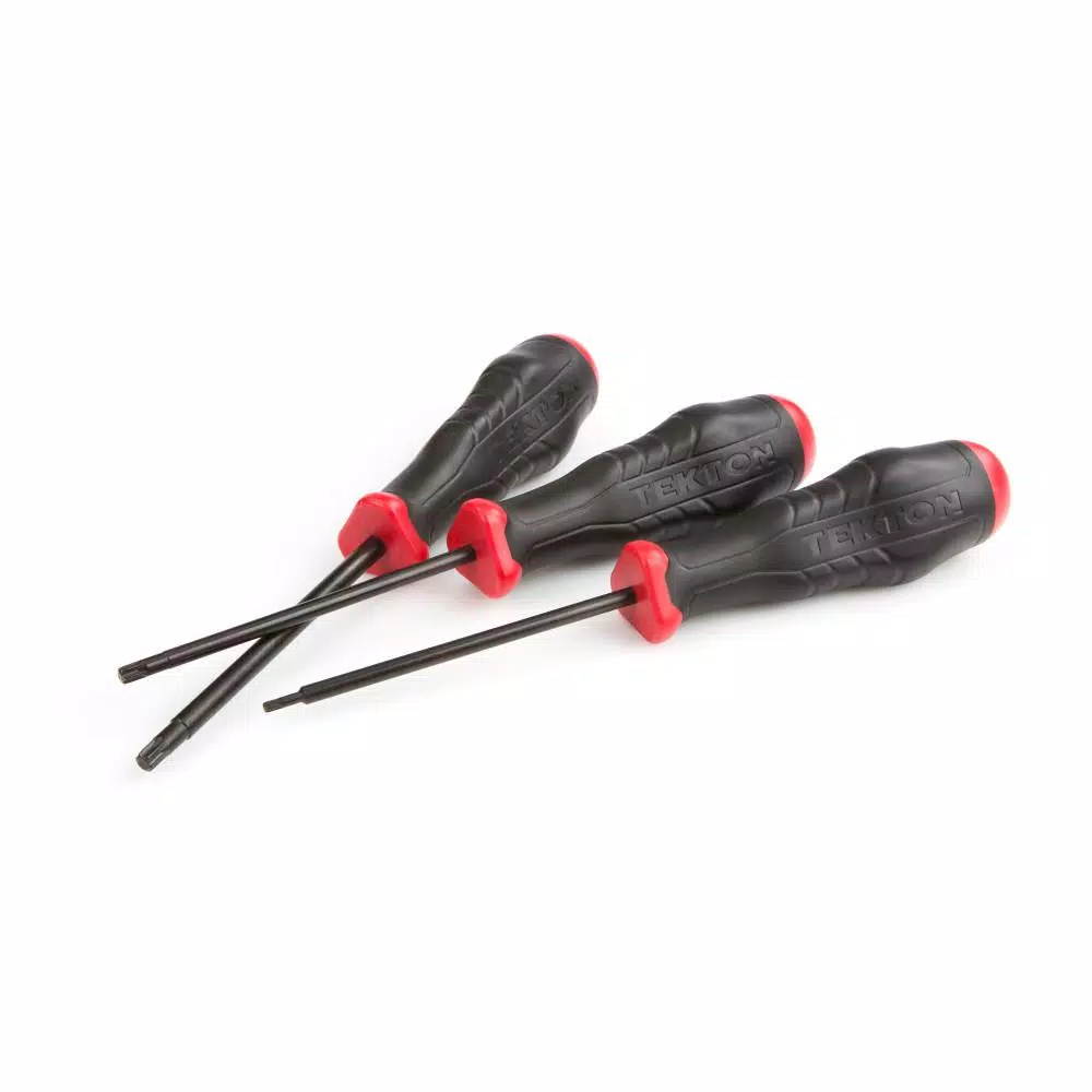 Combine power and speed with the unique handles of the TEKTON 6-pc. Torx® Screwdriver Set. The handles rely on three-sided geometry, not just friction against your skin, giving you the comfortable leverage to break stubborn fasteners loose. For easy installation and assembly work, rounded top and bottom sections let your fingertips spin long fasteners quickly. The blades are made of premium chrome molybdenum steel and are strengthened through an exacting heat treating process. Rather than a layer of plating, the steel surface of the blades is directly treated with a hot black oxide finish—the same process used to protect firearms. This finish can’t flake off, and it preserves the precisely sized tips for an exact fit in fasteners over time. The butt ends have a clear size marking that is easy to identify in your tool belt or chest drawer. TORX® is a registered trademark of Acument Intellectual Properties, LLC