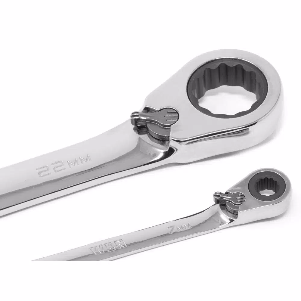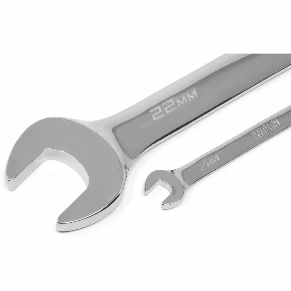 Remember when you had wrenches that lasted. Between the professional-grade, heat-treated, fully-polished chrome vanadium steel and the lifetime warranty, this WEN Combination Wrench set is the last wrench set youβll ever have to buy. Our reversible ratchet design allows users to tighten or loosen in either direction with the simple flip of a lever. This set includes 16 different sized wrenches without skipping any sizes: 7 mm, 8 mm, 9 mm, 10 mm, 11 mm, 12 mm, 13 mm, 14 mm, 15 mm, 16 mm, 17 mm, 18 mm, 19 mm, 20 mm, 21 mm and 22 mm wrenches. Each wrench features 72 internal ratcheting teeth for a 5Β° swing. The 15Β° offset ratchet head provides both finger clearance and easy access to hard-to-reach bolts. The included storage rack gives users a simple solution for organization and transportation, keeping your wrenches accessible whenever you need them. And because its a WEN product, if any of your wrenches ever break, just notify us and weβll provide a replacement. Remember when you had the best of the best. Remember WEN.