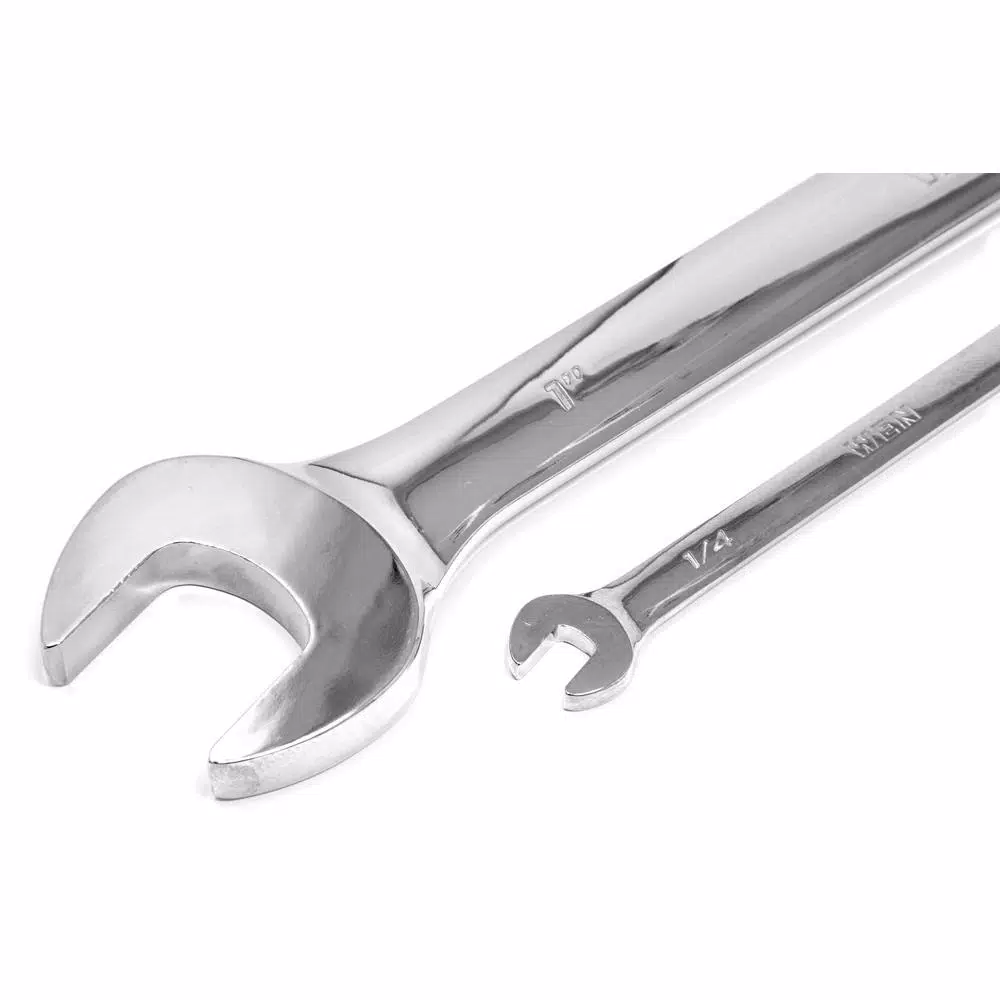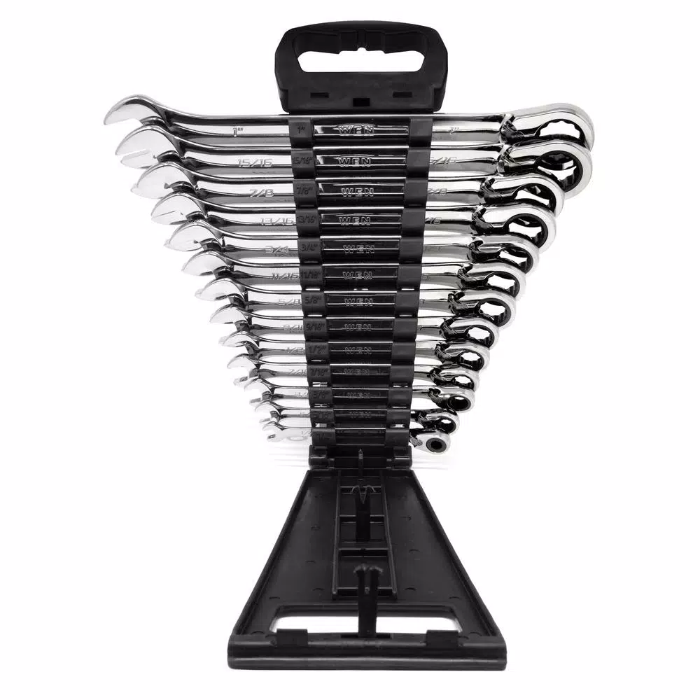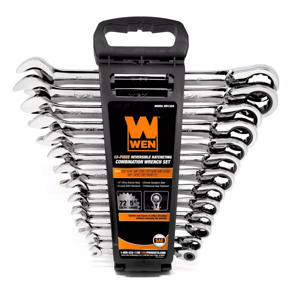 Remember when you had wrenches that lasted. Between the professional-grade, heat-treated, fully-polished chrome vanadium steel and the lifetime warranty, this WEN Combination Wrench set is the last wrench set youβll ever have to buy. Our reversible ratchet design allows users to tighten or loosen in either direction with the simple flip of a lever. This set includes 13 different sized wrenches without skipping any sizes: 1/4 in., 5/16 in., 3/8 in., 7/16 in., 1/2 in., 9/16 in., 5/8 in., 11/16 in., 3/4 in., 13/16 in., 7/8 in., 15/16 in. and 1 in. wrenches. Each wrench features 72 internal ratcheting teeth for a 5Β° swing. The 15Β° offset ratchet head provides both finger clearance and easy access to hard-to-reach bolts. The included storage rack gives users a simple solution for organization and transportation, keeping your wrenches accessible whenever you need them. And because its a WEN product, if any of your wrenches ever break, just notify us and weβll provide a replacement. Remember when you had the best of the best. Remember WEN.